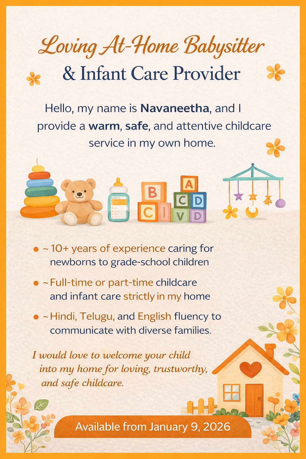 Hello, my name is Navaneetha, and I offer a loving, in-home babysitting service. I have over 10 years of experience caring for children from newborns to school-age and have been blessed to support 10+ families, giving children the love, patience, and gentle attention they need to feel safe and happy. At my home, I provide warm, attentive, and hands-on care in a calm, clean, and comfortable environment, treating children like family. Parents can feel at ease knowing their little ones are in a peaceful, caring space throughout the day. I specialize in infant care, last-minute babysitting, and both full-time and part-time care. I have experience with newborns, toddlers, preschoolers, and school-age children, and I always ensure each child receives care tailored to their needs and daily routine. I enjoy spending time with children through storytelling, simple learning activities, and gentle homework support, helping them feel confident, engaged, and loved. For babies, I also provide light, safe, home-style meal preparation, always keeping hygiene, safety, and nutrition in mind. I am kind, patient, and dependable, and I speak Hindi, English, and Telugu, which helps me communicate comfortably with families and children. I am available to start from January 9, 2026. I would be happy to welcome your child into my home and provide loving, trustworthy, and caring childcare for your family.